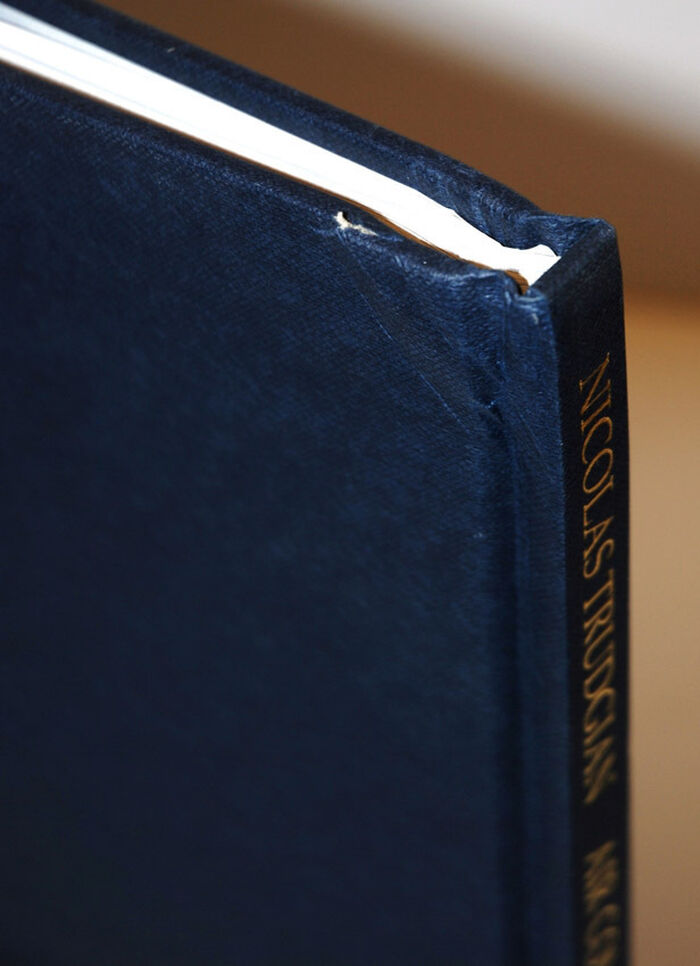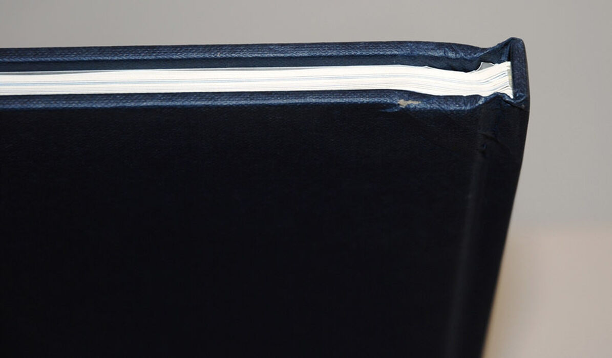 Back top corner by spine, board is heavily bumped with some damage.