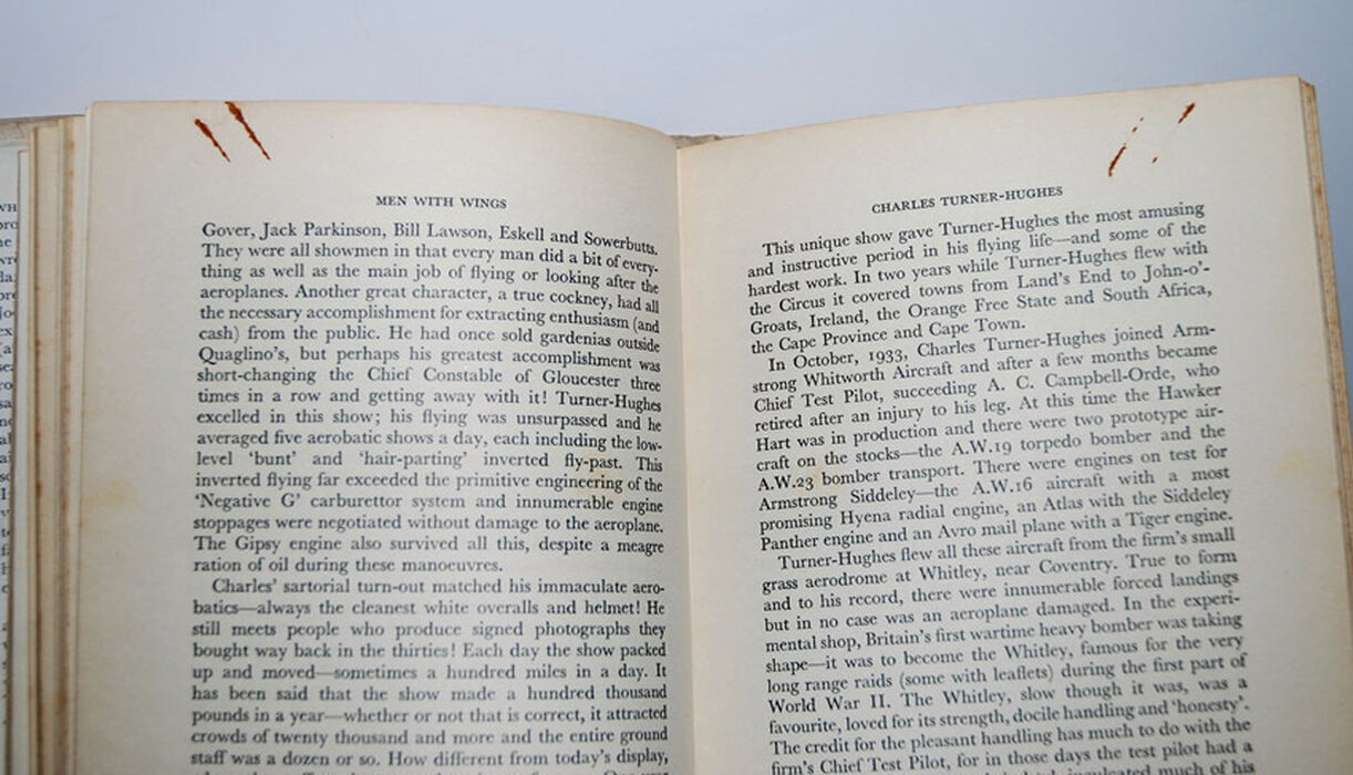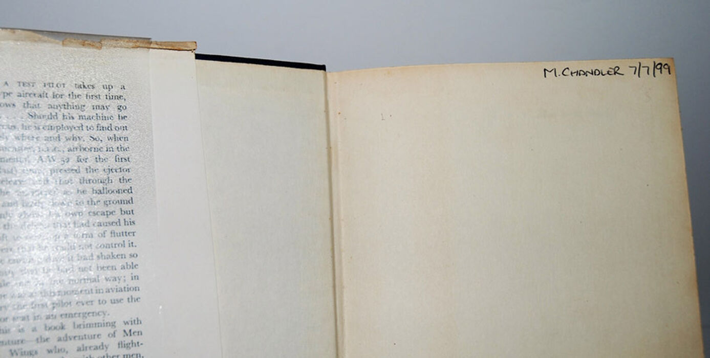 Name and date of previous owner written on fep, Endpapers with discolouration strip.