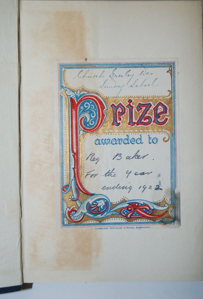 Endpapers discoloured with Presentation/prize plate dated 1922.