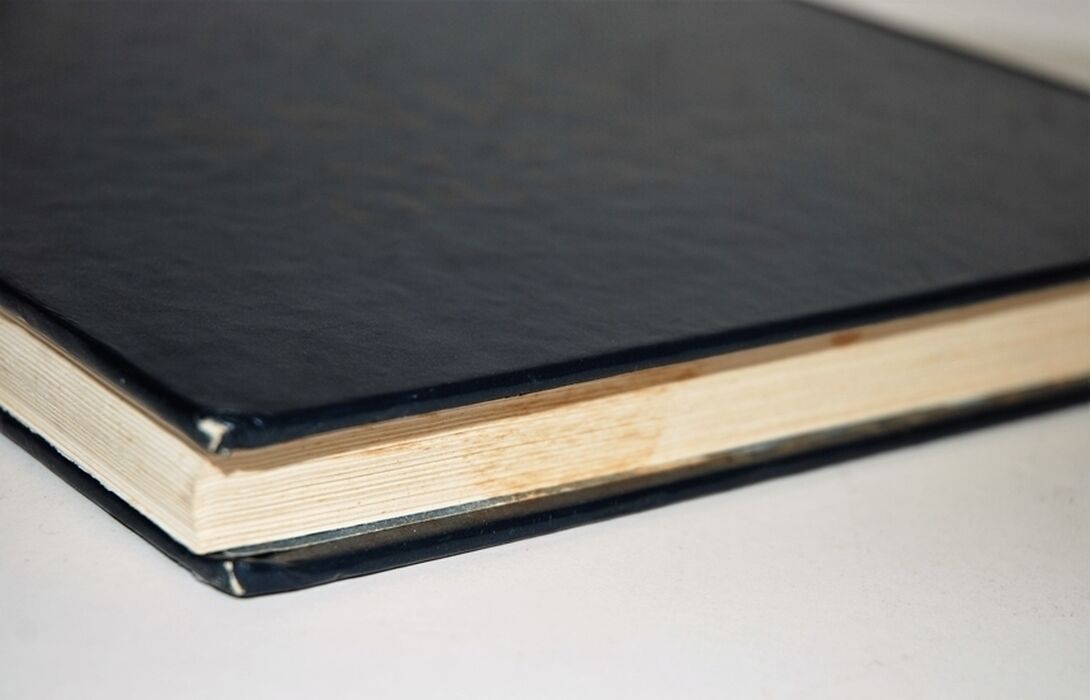 Top and Fore edge with slight spotting, Top edge with stain which has seeped onto first few pages a little and to back inside board.