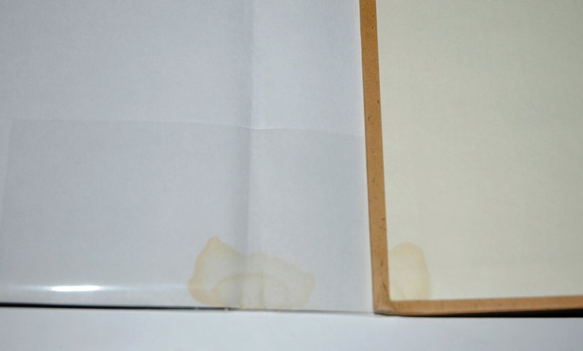 Reverse side of dust wrapper front flap fold with mark/water stain - not visible from front, which has made a small mark to the inside cover .