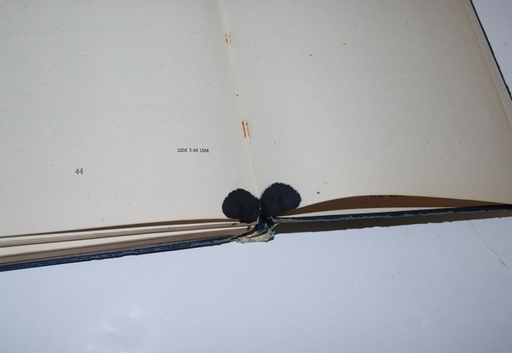Pages 102 -118 loose from binding exposing netting, bottom of last few pages, tail edge and back endpaper with ink mark.