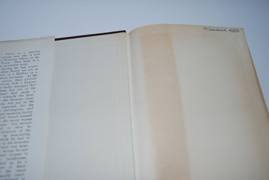 Discolouration strip on Endpapers, Pages with age discolouration/tanning.