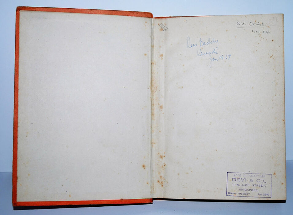 Inside covers and endpapers with discolouration and a few foxing type marks, Names and dates written in ink and small stamp on fep.